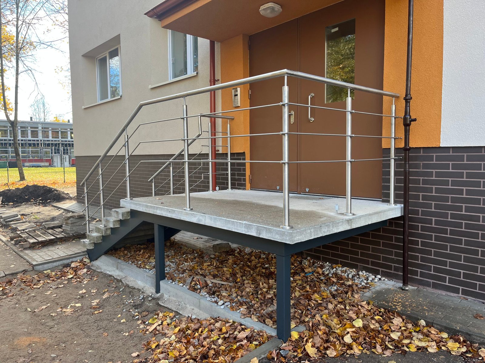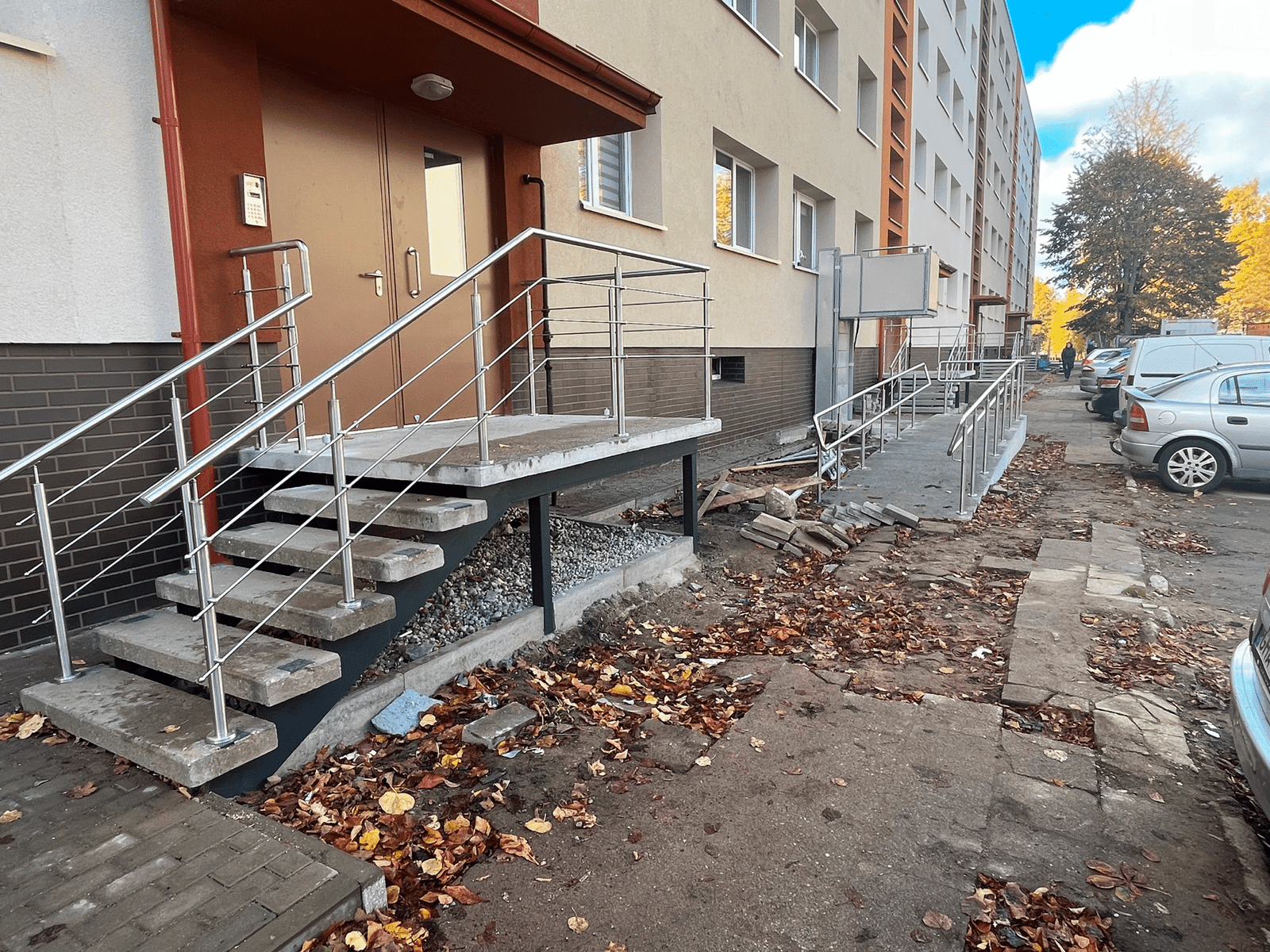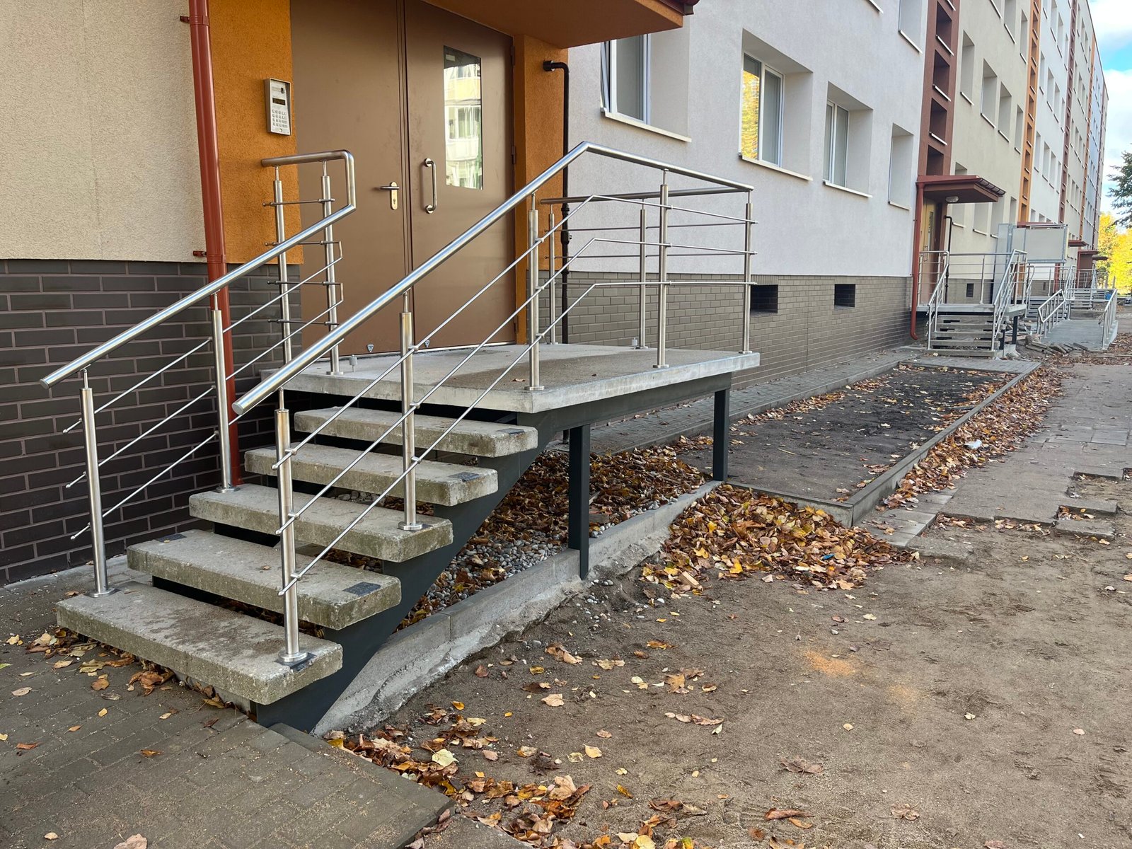 Daugiabučių įėjimo laiptai, betoninės aikštelės ir pakopos, nerūdijančio plieno turėklai.