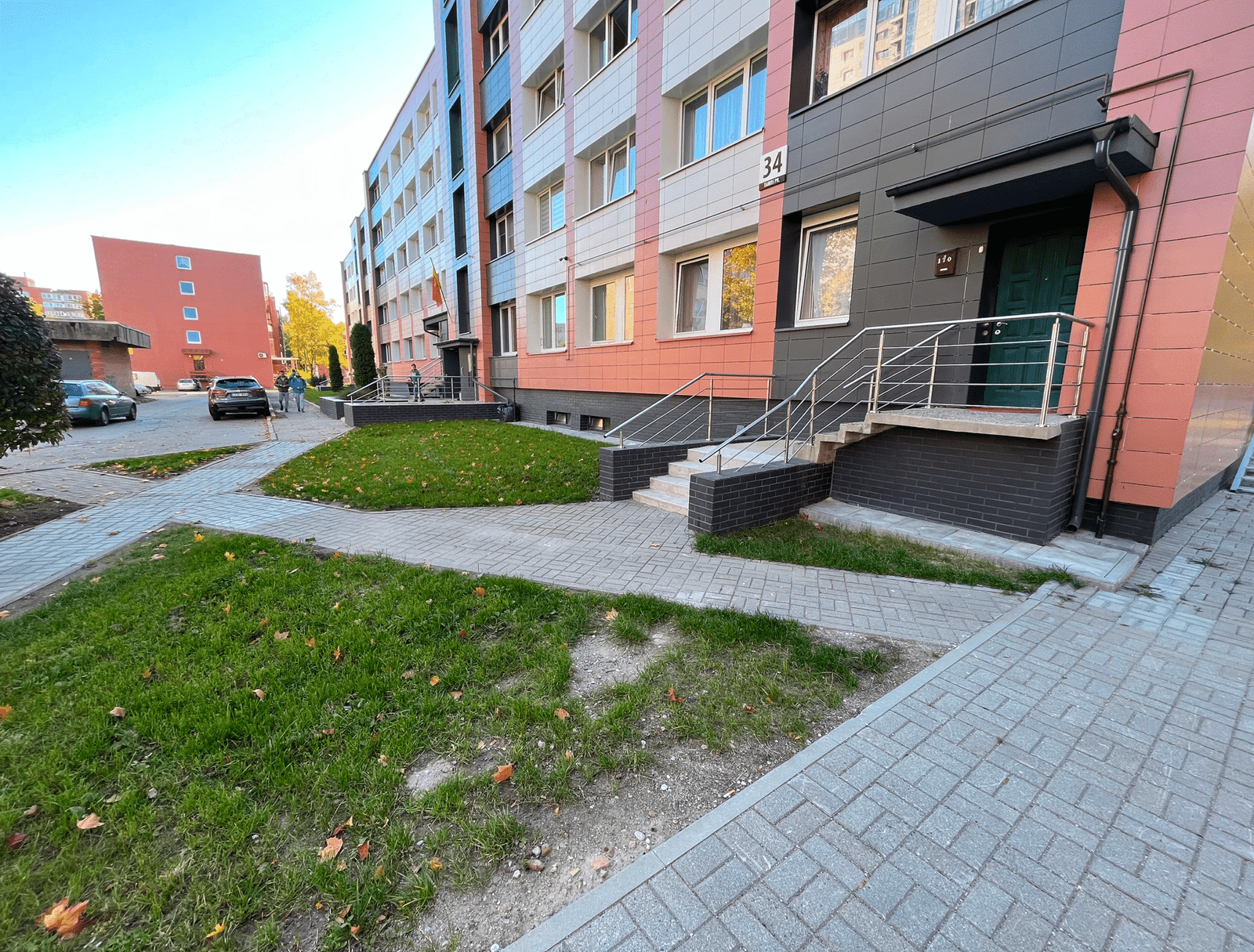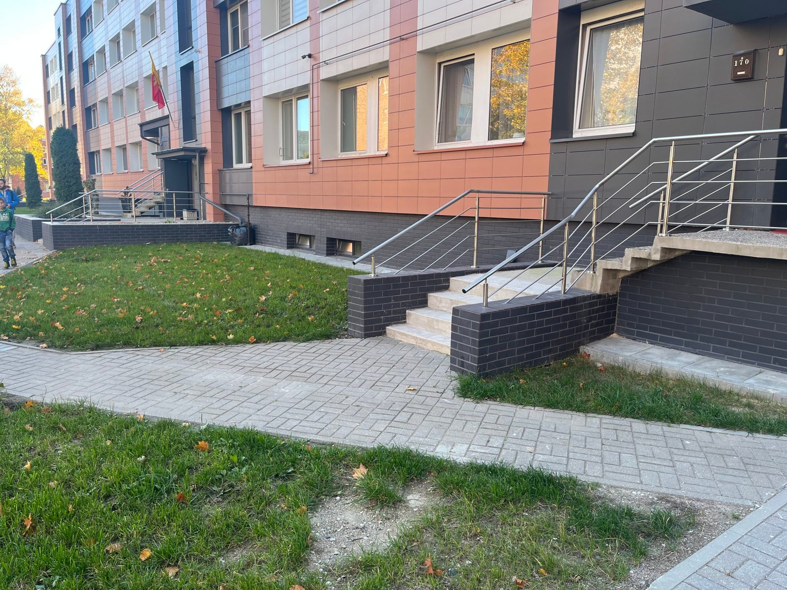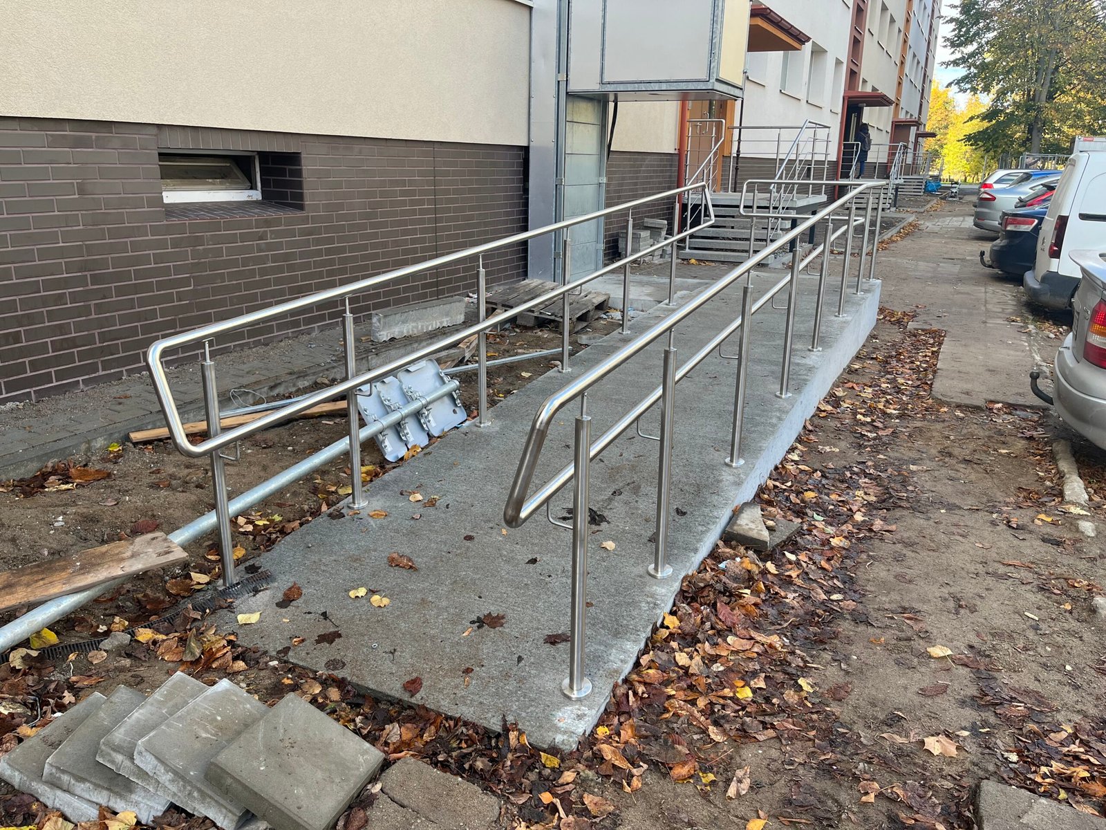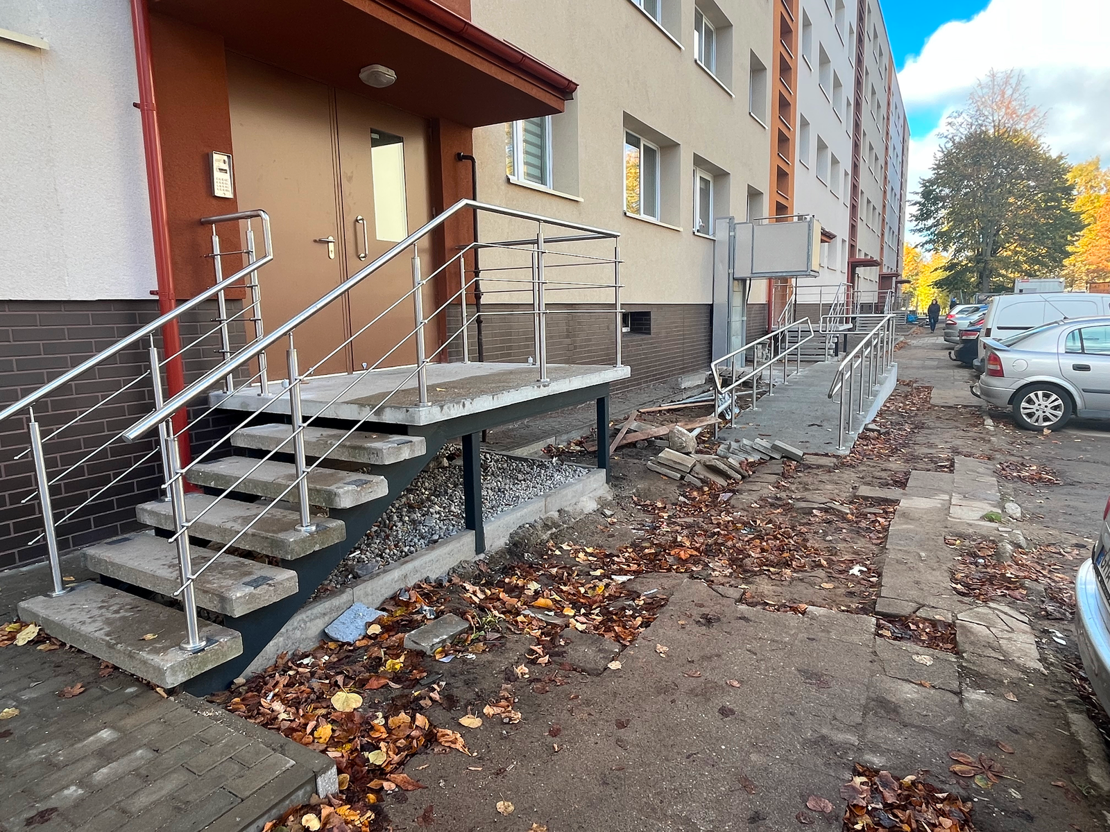 Daugiabučių įėjimo laiptai, betoninės aikštelės ir pakopos, nerūdijančio plieno turėklai.