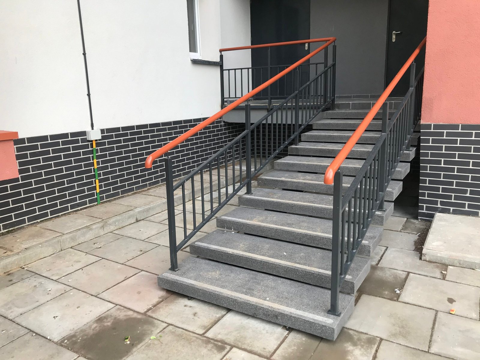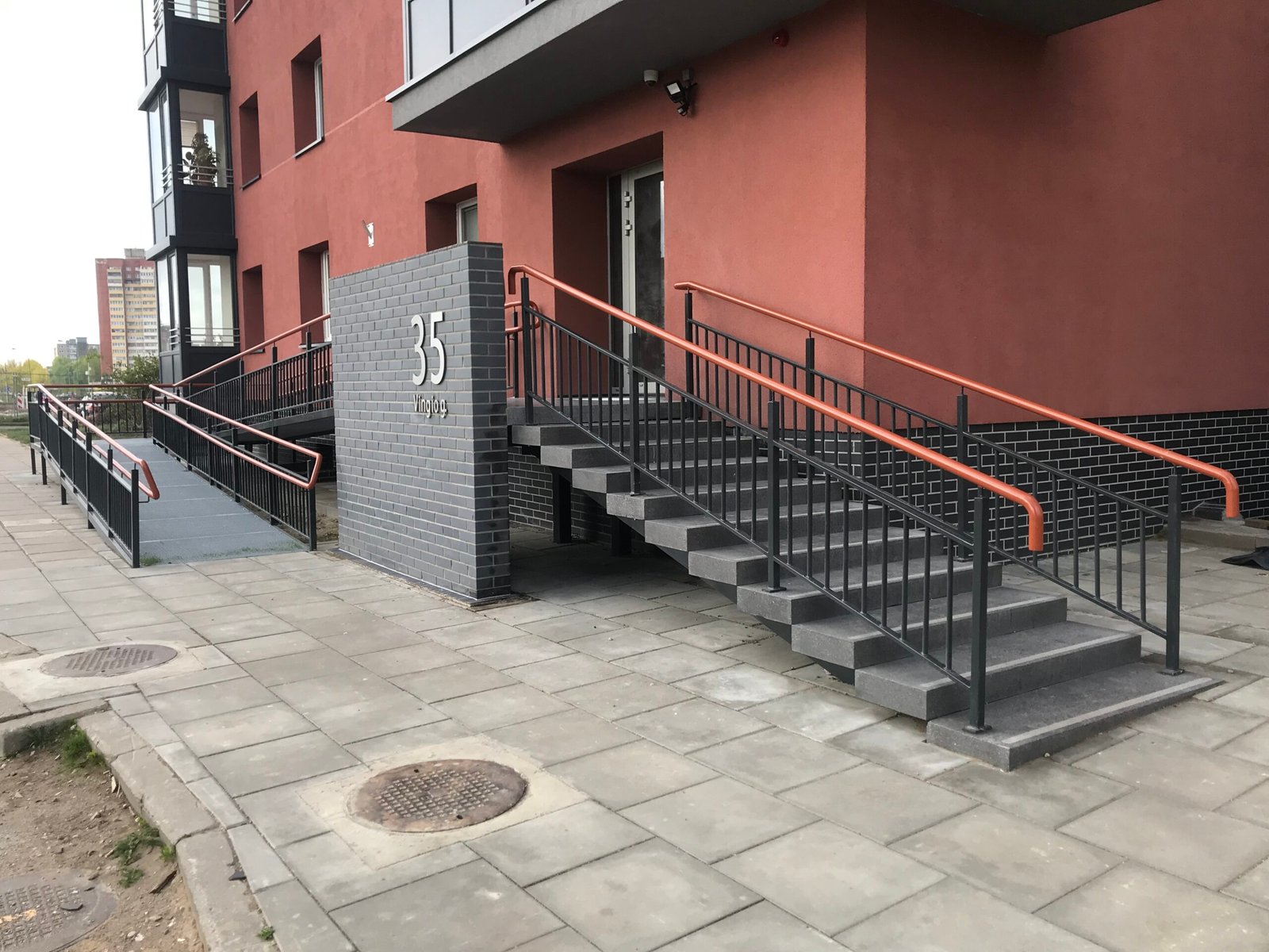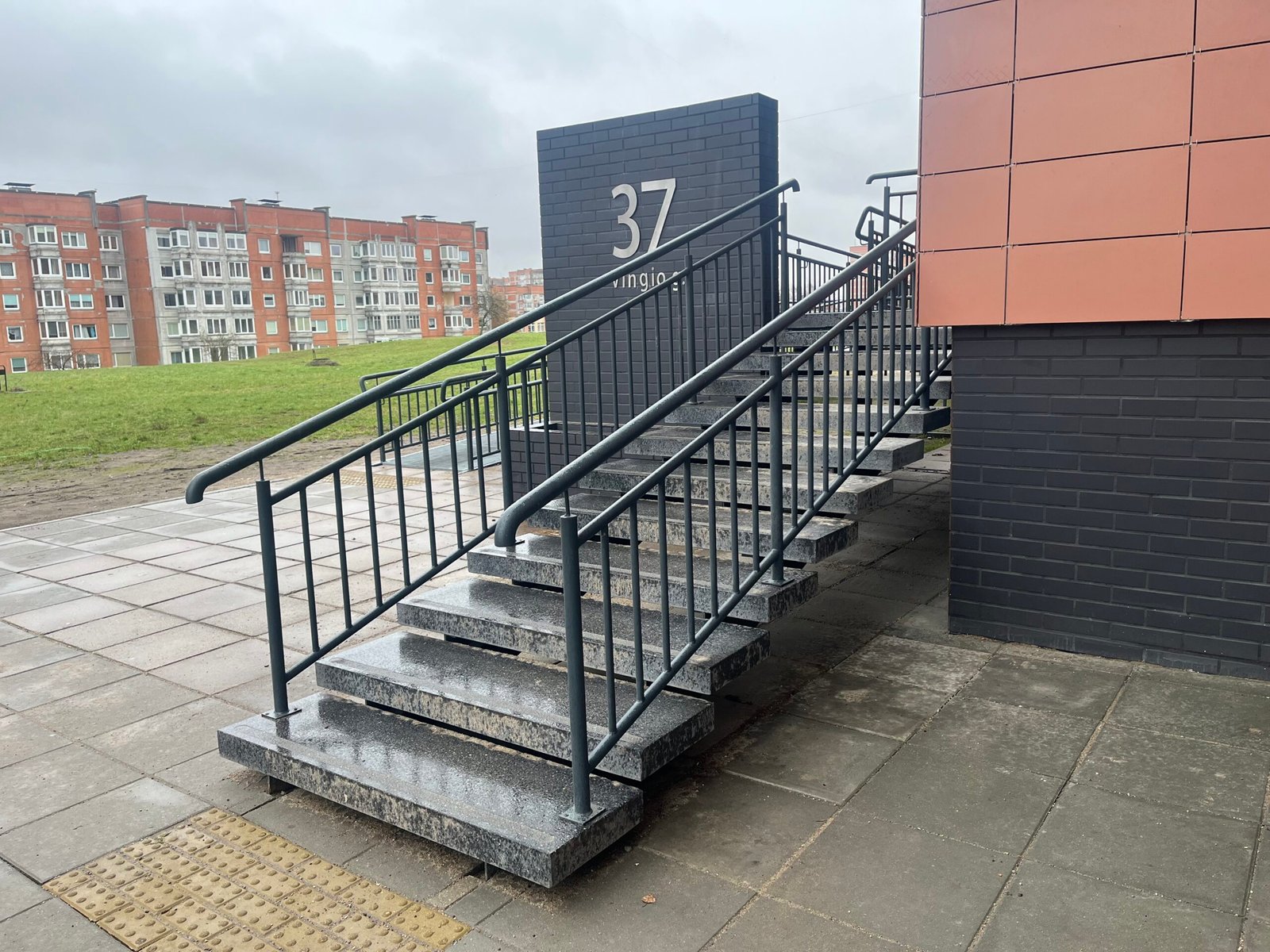 Daugiabučių įėjimo laiptai, betoninės aikštelės ir pakopos, nerūdijančio plieno turėklai.