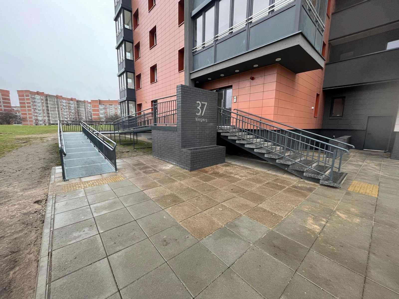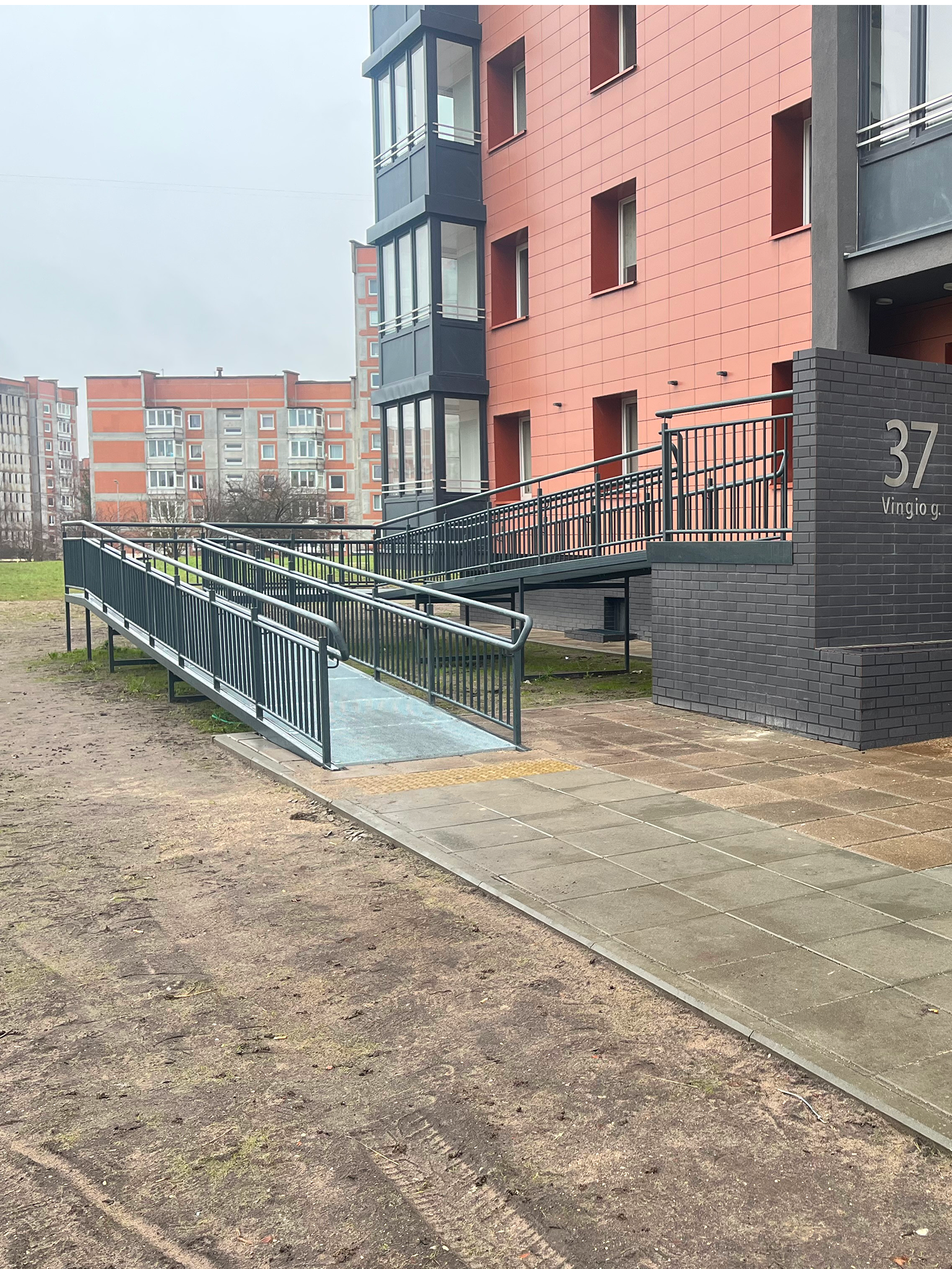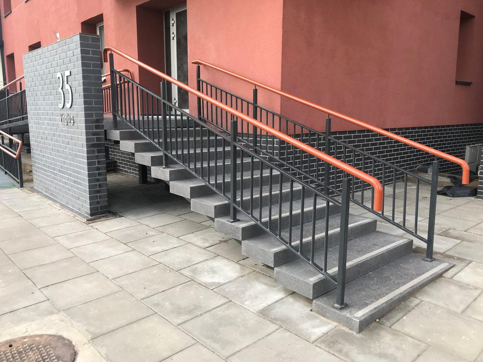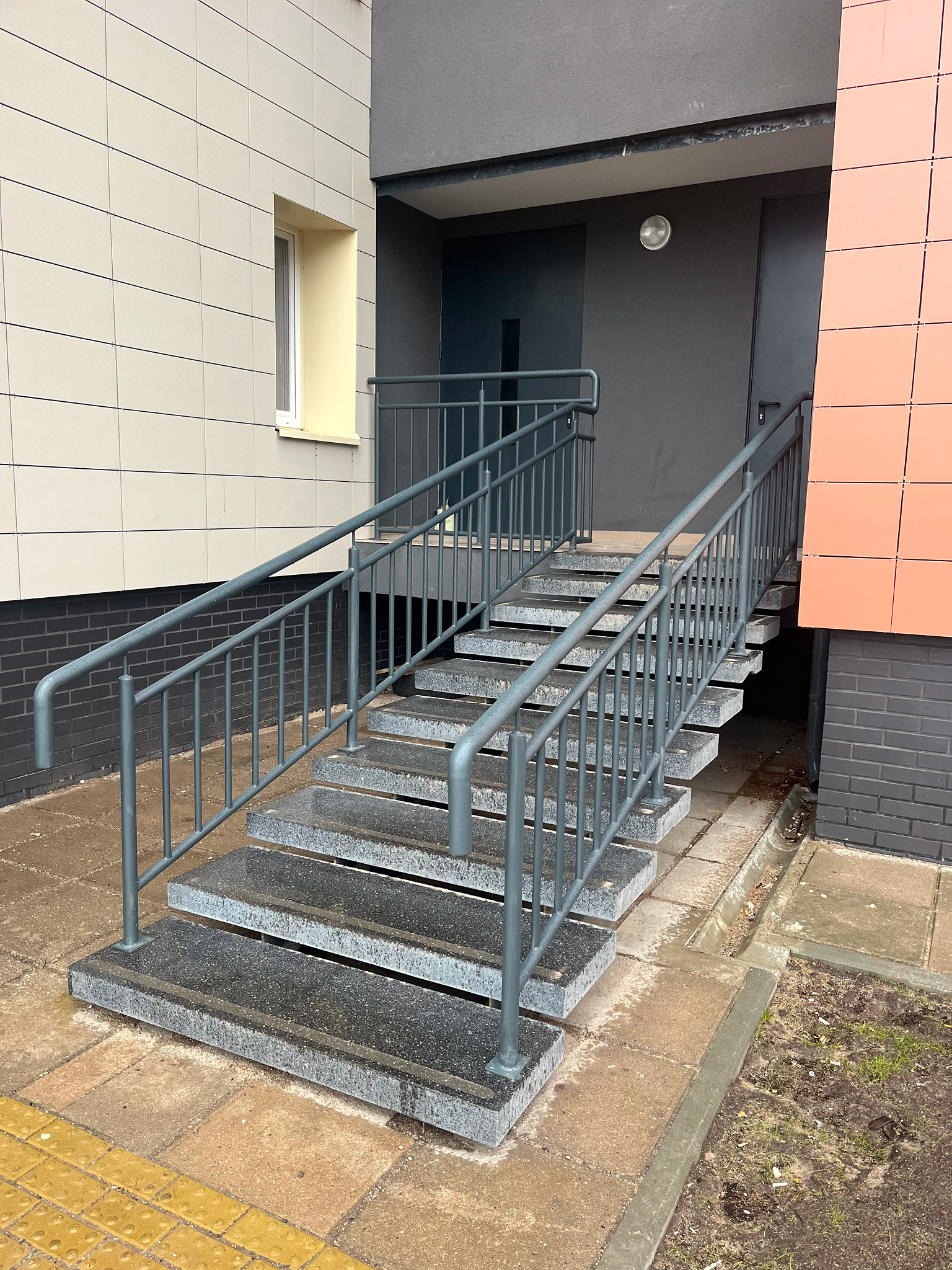 Daugiabučių įėjimo laiptai, betoninės aikštelės ir pakopos, nerūdijančio plieno turėklai.
