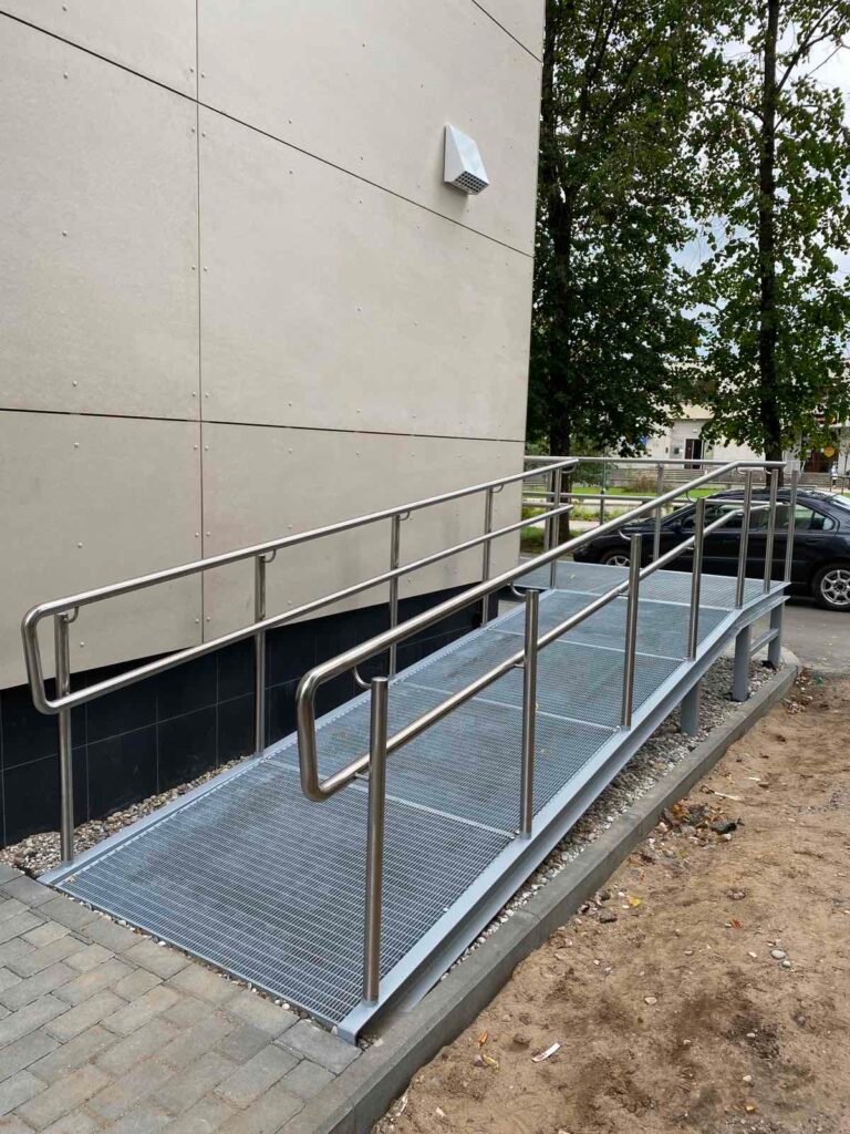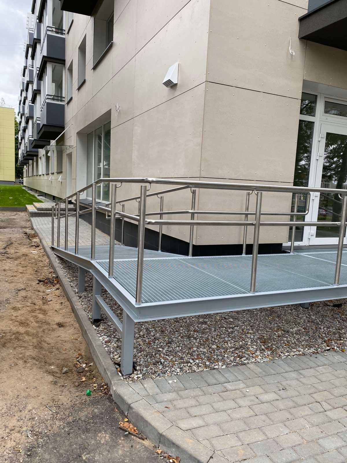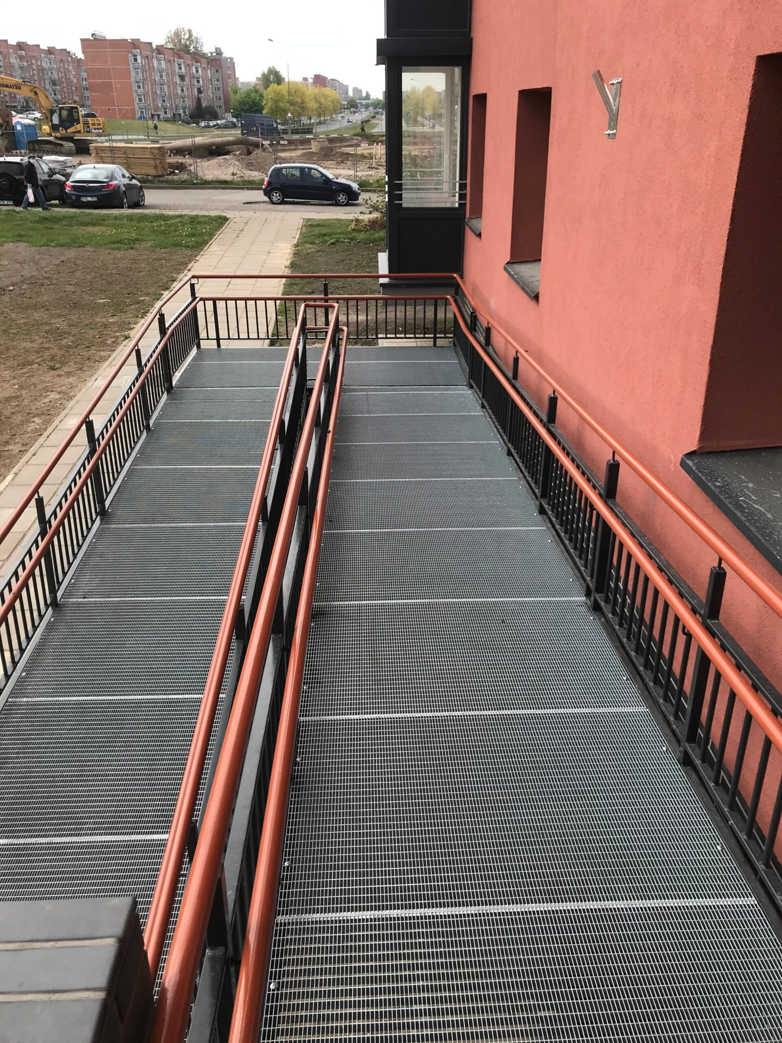 ŽN pandusas, lauko laiptai ir turėklai, teracinio betono pakopos, nerūdijančio plieno turėklai