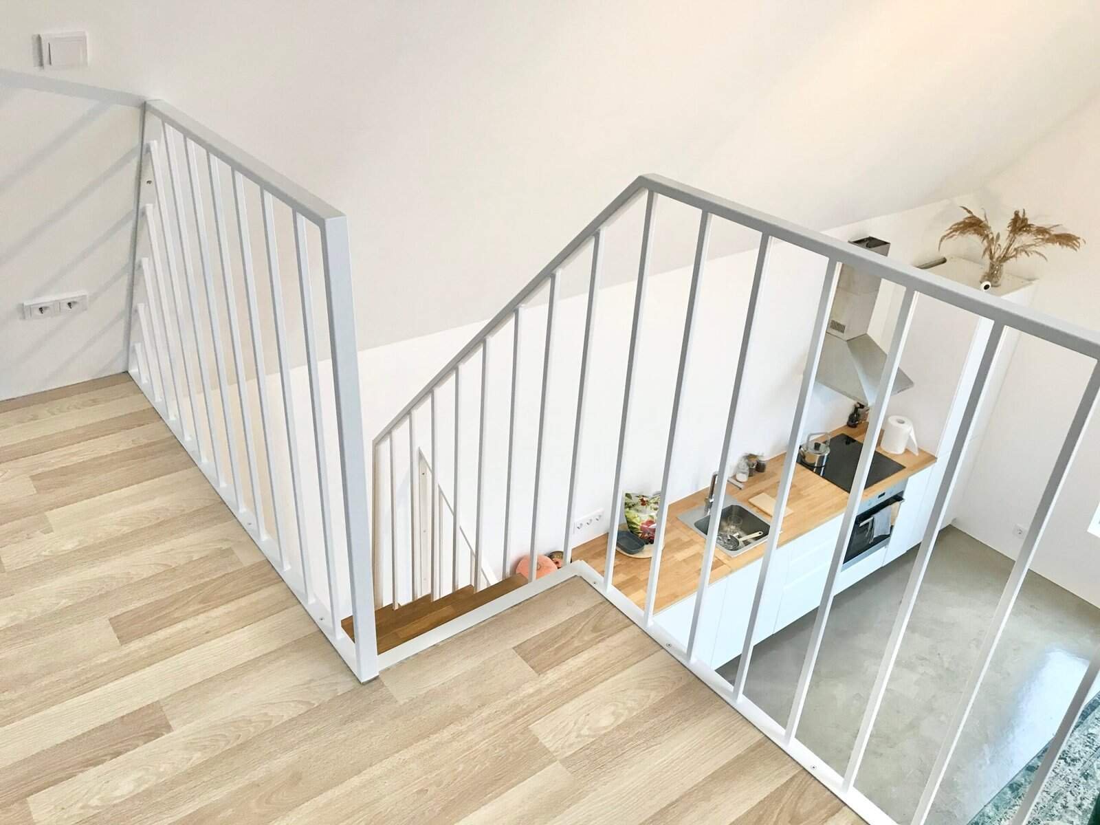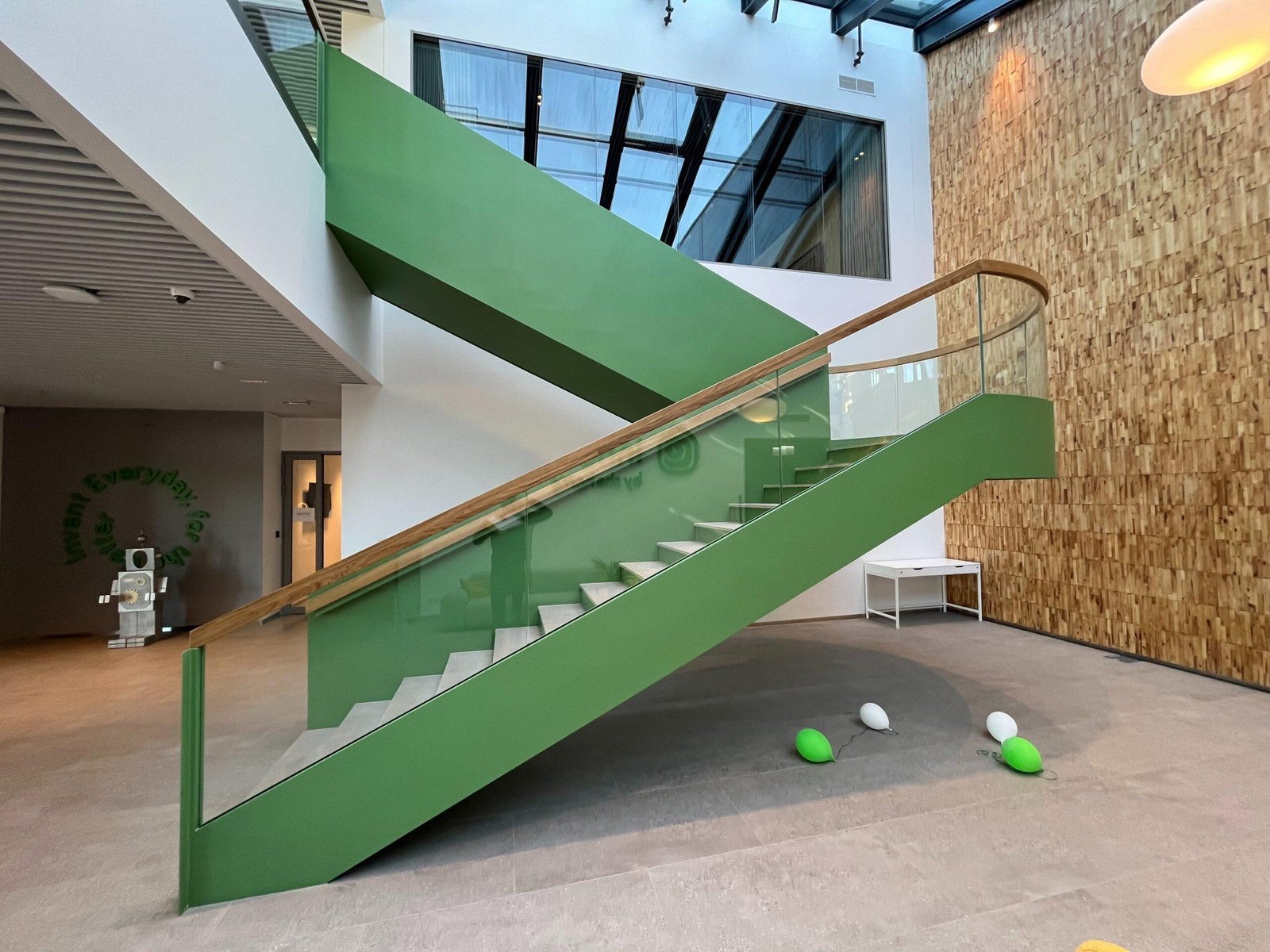 Metaliniai laiptai su stiklo turėklais ir ąžuolo pakopomis